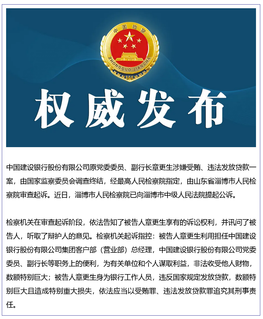 9月8日,据最高人民检察院消息,中国建设银行股份有限公司原党委委员、副行长章更生涉嫌受贿、违法发放贷款一案,由国家监察委员会调查终结,经最高人民检察院指定,由山东省淄博市人民检察院审查起诉。近日,淄博市人民检察院已向淄博市中级人民法院提起公诉。