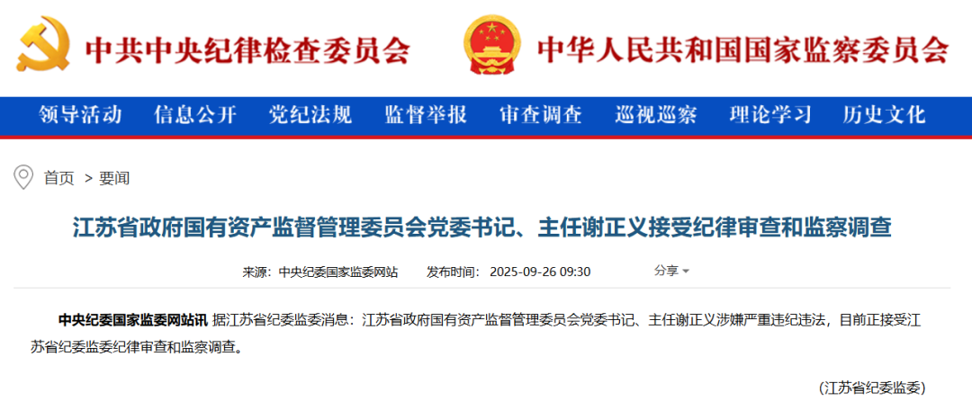 9月26日,据中央纪委国家监委网站消息:江苏省政府国有资产监督管理委员会党委书记、主任谢正义涉嫌严重违纪违法,目前正接受江苏省纪委监委纪律审查和监察调查。