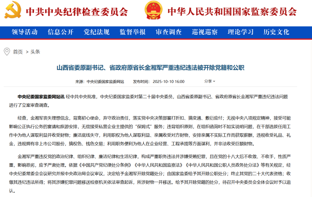 10月10日,据中央纪委国家监委网站消息:经中共中央批准,中央纪委国家监委对第二十届中央委员,山西省委原副书记、省政府原省长金湘军严重违纪违法问题进行了立案审查调查。