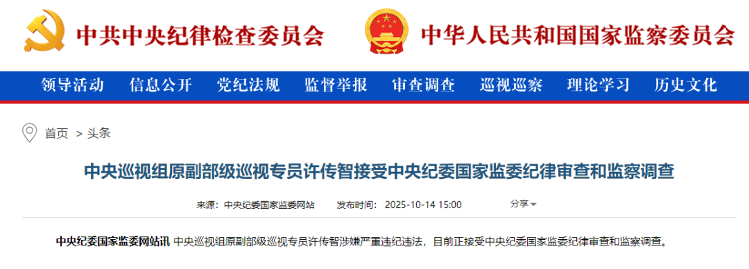 中央巡视组原副部级巡视专员许传智涉嫌严重违纪违法,目前正接受中央纪委国家监委纪律审查和监察调查。