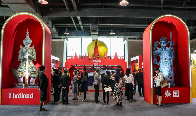 9月21日,在第八届丝绸之路(敦煌)国际文化博览会上,与会嘉宾参观主宾国泰国展厅。