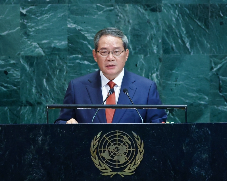 当地时间9月26日,国务院总理李强在纽约联合国总部出席第80届联合国大会一般性辩论并发表讲话。新华社记者 刘彬 摄