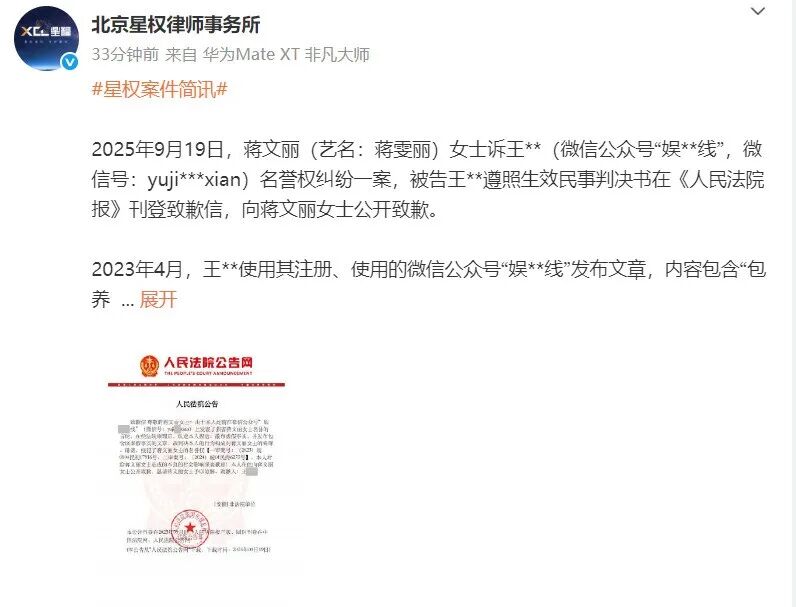 2025年9月19日,蒋文丽(艺名:蒋雯丽)女士诉王**(微信公众号“娱**线”,微信号:yuji***xian)名誉权纠纷一案,被告王**遵照生效民事判决书在《人民法院报》刊登致歉信,向蒋文丽女士公开致歉。