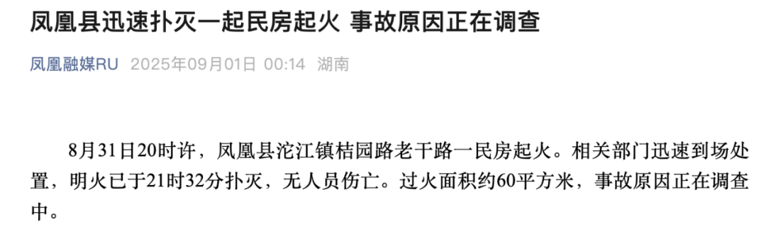 据湖南省凤凰县广播电视台报道,8月31日20时许,凤凰县沱江镇桔园路老干路一民房起火。相关部门迅速到场处置,明火已于21时32分扑灭,无人员伤亡。过火面积约60平方米,事故原因正在调查中。