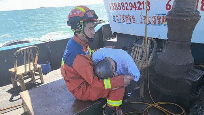 接到报警后消防员立即赶到现场,只见男子十分虚弱,因此处离岸较远,礁石陡峭、通行困难。为迅速将男子救出,消防员果断改变原定陆路撤离方案,紧急协调附近渔船参与救援。