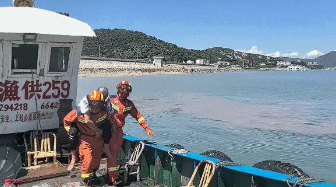 在公安和镇政府工作人员的配合下,渔船迅速抵达礁石附近水域,消防员小心地将男子背上船,安全转运至码头。