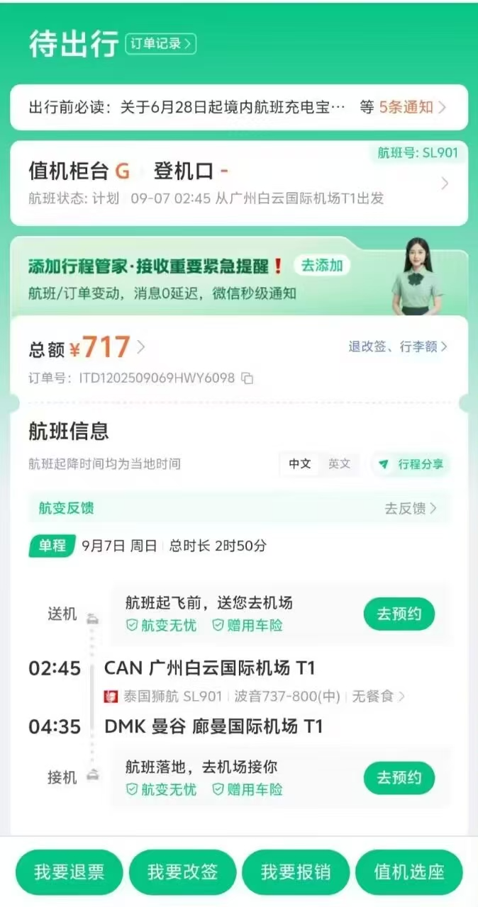 根据阿志给孙女士发来的订票信息,阿志是搭乘的9月7日凌晨2点45分从广州白云机场出发的泰国狮航SL901航班抵达曼谷的。随后阿志也一直在和孙女士聊天,告诉她曼谷的一些见闻,并表示“在泰国3天左右就去新加坡”“新加坡要待20多天”。