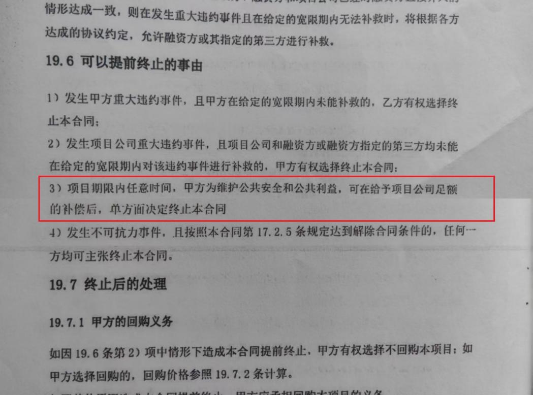 记者发现,合同中约定内容有:“项目期限内任意时间,甲方为维护公共安全和公共利益,可在给予项目公司足额补偿后,单方面决定终止本合同。”