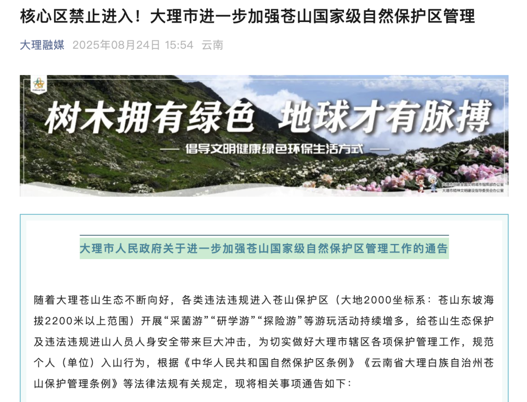 央视报道播出后,8月24日,大理市人民政府发布通告强调,违法违规进入苍山保护区开展“采菌游”“研学游”“探险游”等游玩活动,给苍山生态保护及违法违规进山人员人身安全带来巨大冲击。