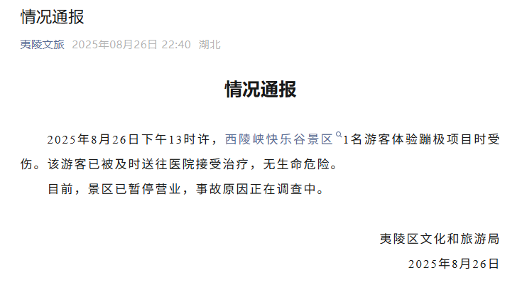 2025年8月26日下午13时许,西陵峡快乐谷景区1名游客体验蹦极项目时受伤。该游客已被及时送往医院接受治疗,无生命危险。