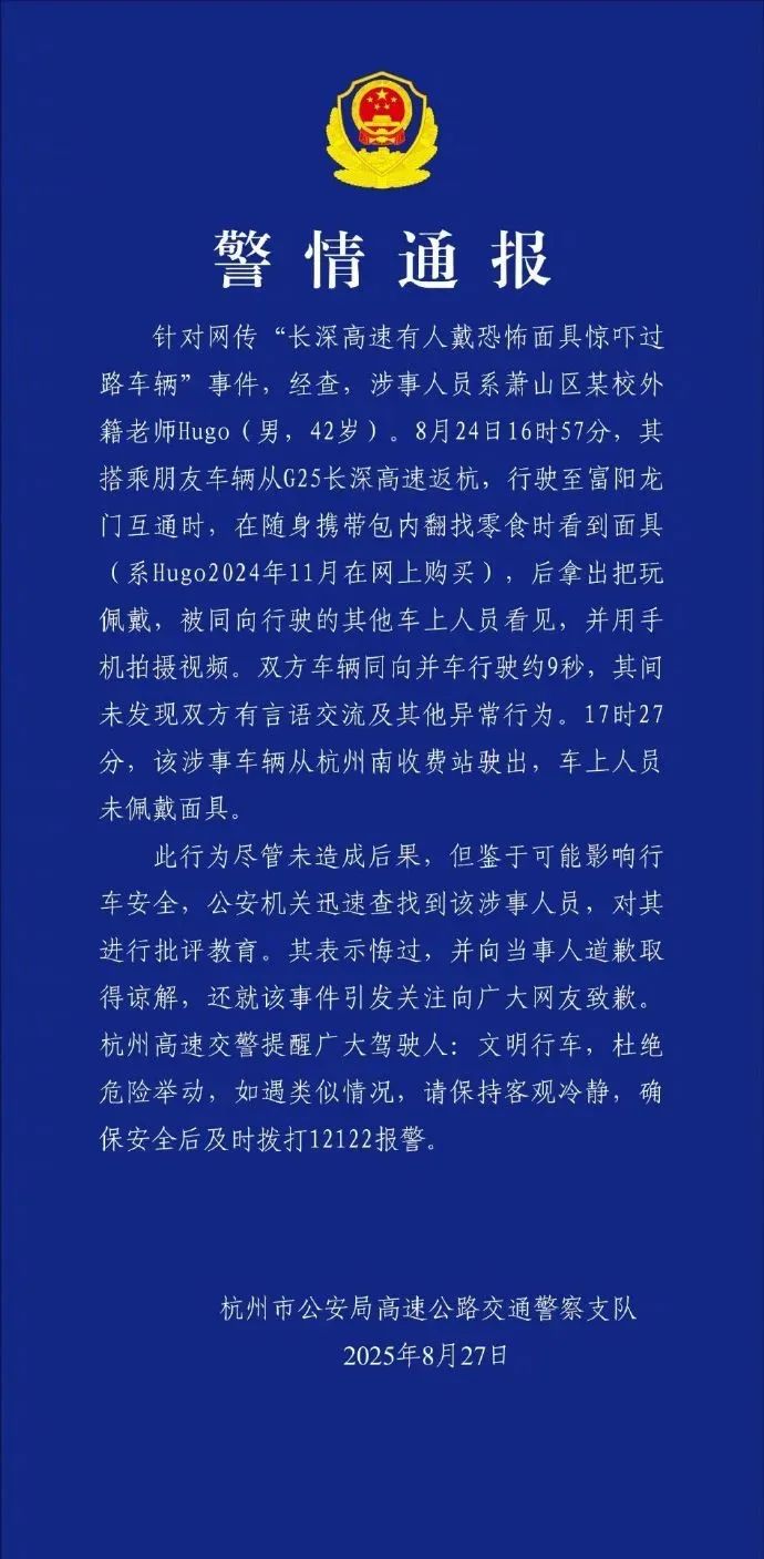 8月27日,杭州市公安局高速公路交通警察支队针对网传“长深高速有人戴恐怖面具惊吓过路车辆”事件发布警情通报。