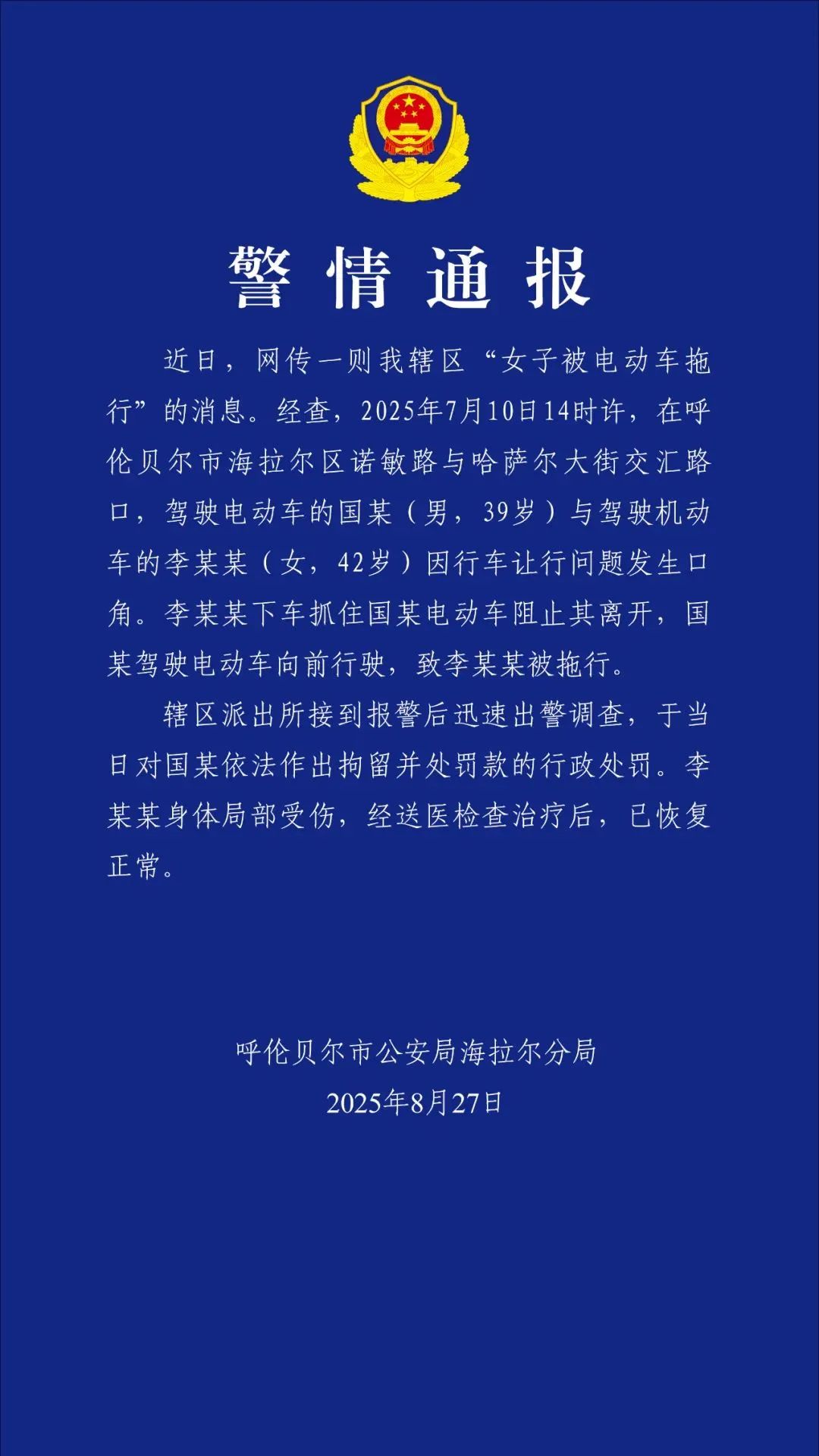 8月27日晚,呼伦贝尔市公安局海拉尔分局发布警情通报: