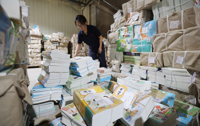 8月16日,河北省石家庄市元氏县新华书店工作人员在仓库清点新学期教材。