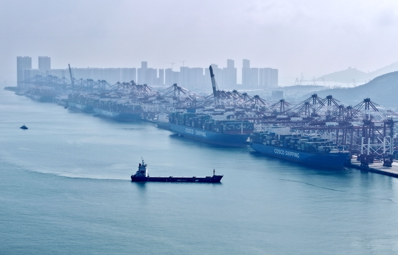 8月19日,一艘货轮在山东港口青岛港前湾港区装卸集装箱(无人机照片)。