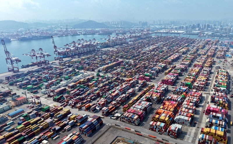 8月19日,货轮在山东港口青岛港前湾港区装卸集装箱(无人机照片)。