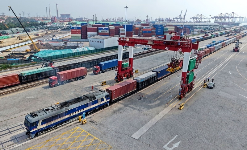 8月19日,一列装载集装箱的货运列车从山东港口青岛港前湾港区海铁联运中心堆场驶出(无人机照片)。