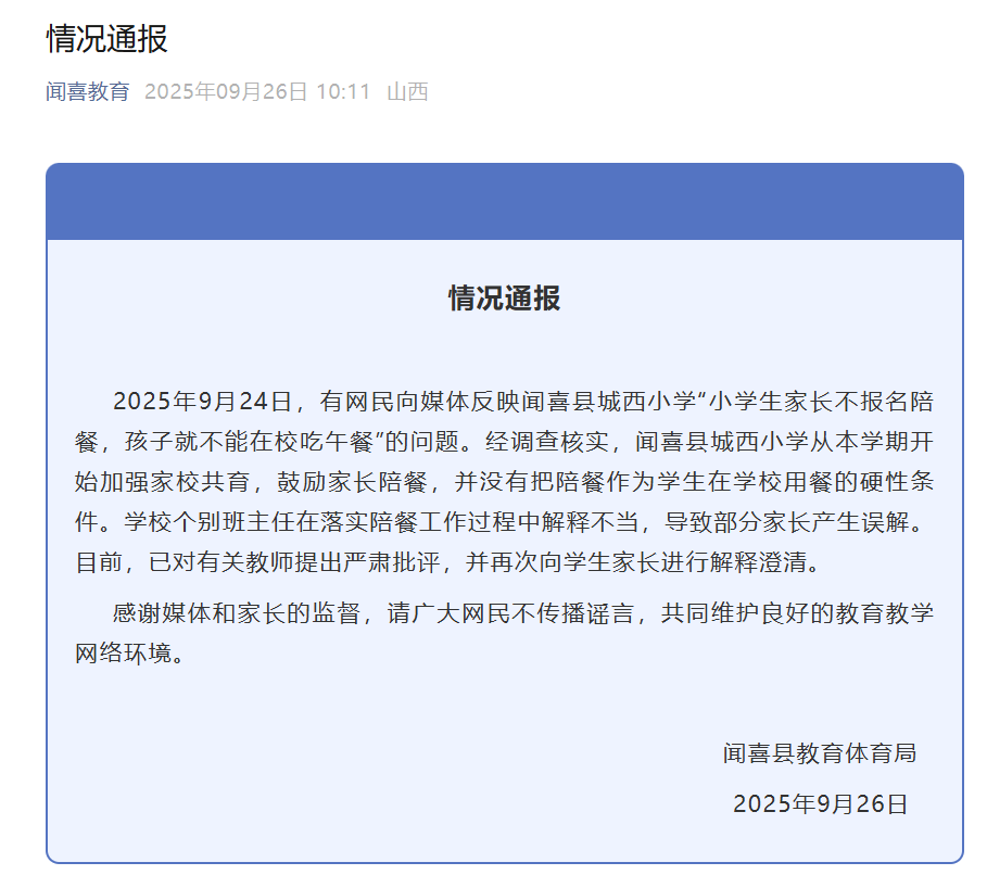 经调查核实,闻喜县城西小学从本学期开始加强家校共育,鼓励家长陪餐,并没有把陪餐作为学生在学校用餐的硬性条件。学校个别班主任在落实陪餐工作过程中解释不当,导致部分家长产生误解。
